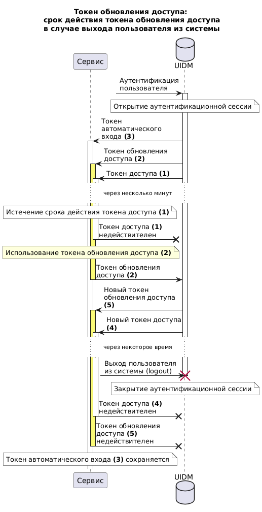 Срок действия токена обновления доступа рекомендуется настроить заметно бóльшим, чем время жизни токена доступа. От разницы в настройке времени жизни токена обновления и токена доступа зависит время, в течение которого сервис сможет обновить доступ без выполнения пользователем повторной аутентификации.